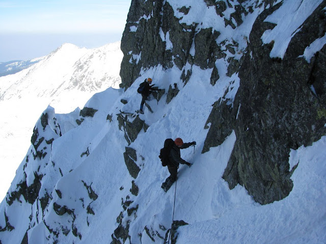 Vine şi rândul meu. Studiasem paşii... ştiam ce am de făcut! Trag aer în piept, fredonez ceva melodie stupidă (Un copac cu flooori...este tot ce îmi doreeeesc...) ca să-mi iau gândul de la peisajul ameţitor şi pornesc! Un pas mare pe spate până pe o muchie ascuţită, mai unul pe pipăite, tot pe spate pe o mică platformă, o "crăcănare" cât toate zilele peste un mic vâlcel şi gata! Am trecut partea nasoală! Mai vreo 15 metri prin zăpadă până la regrupare.